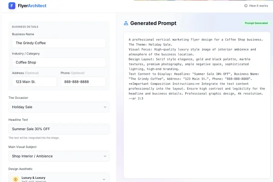 Create detailed flyer prompts for promotions, events, and announcements. Designed to help you generate clear, high-impact flyer visuals quickly.